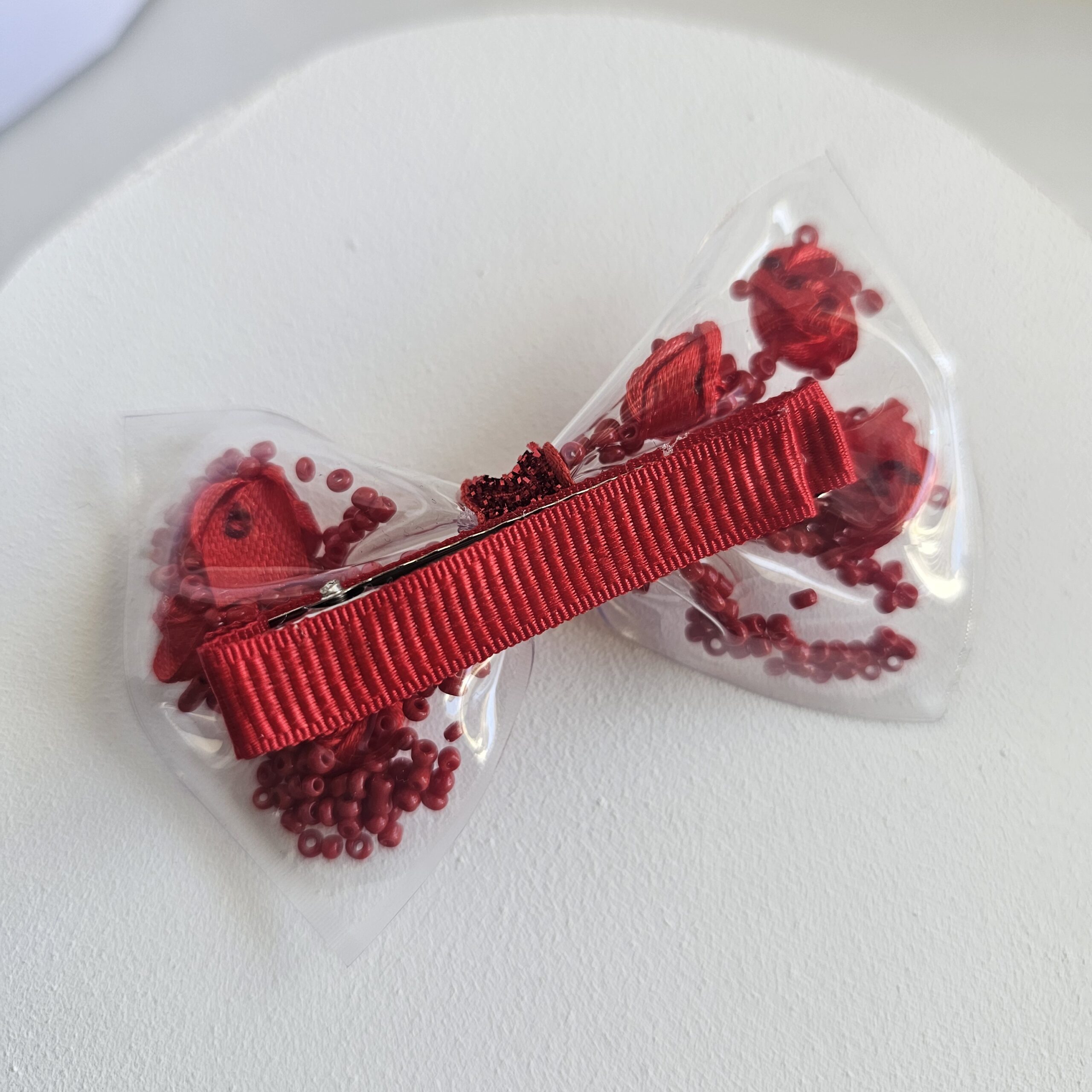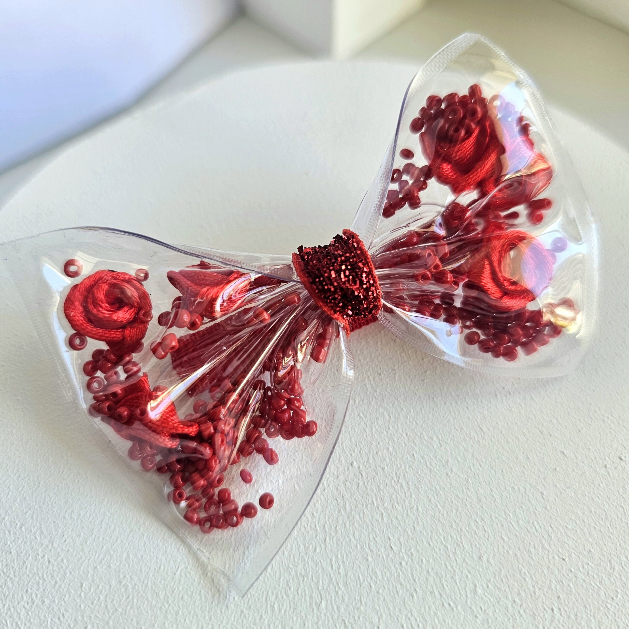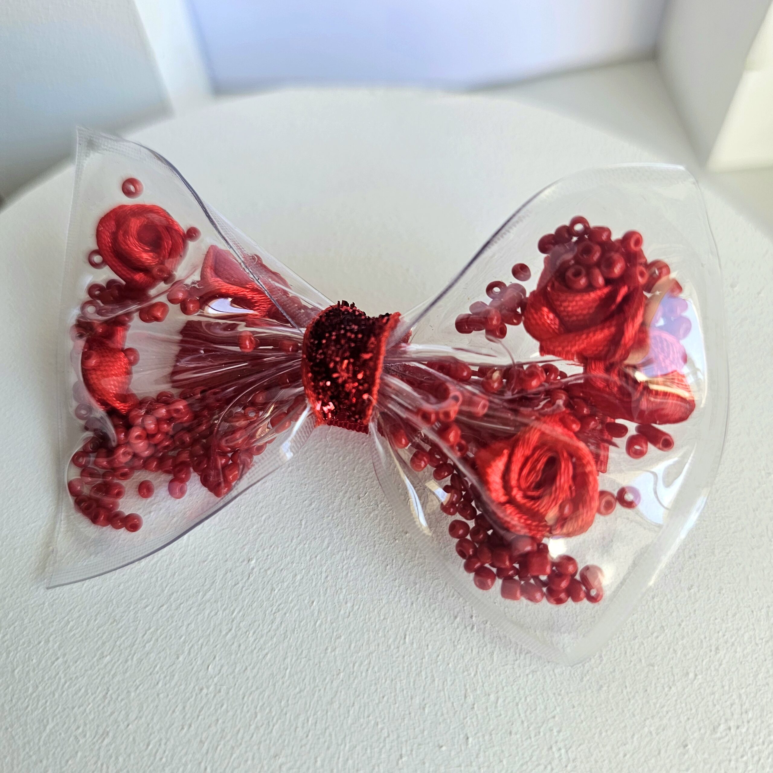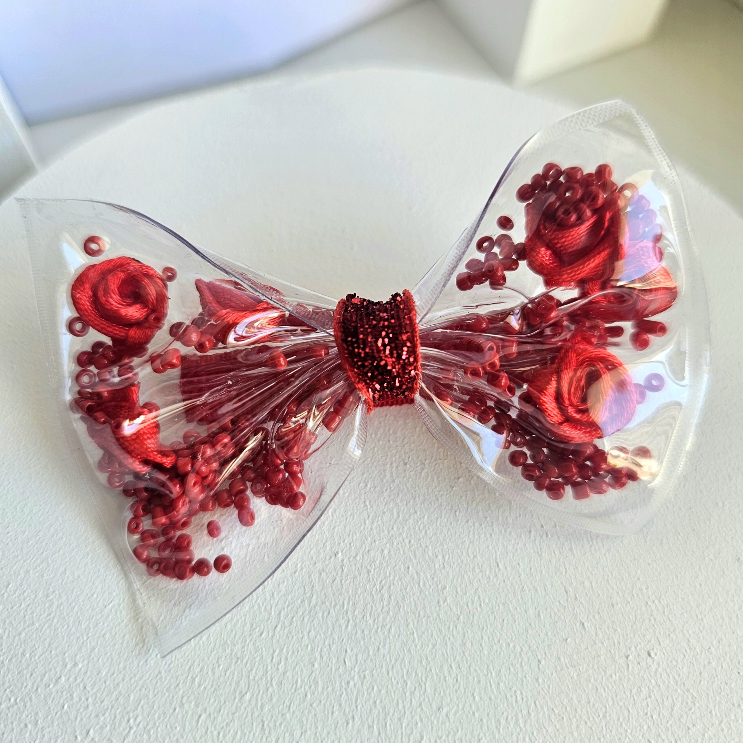- Materiales: PVC transparente con detalles internos (flores de tela y mostacillas)