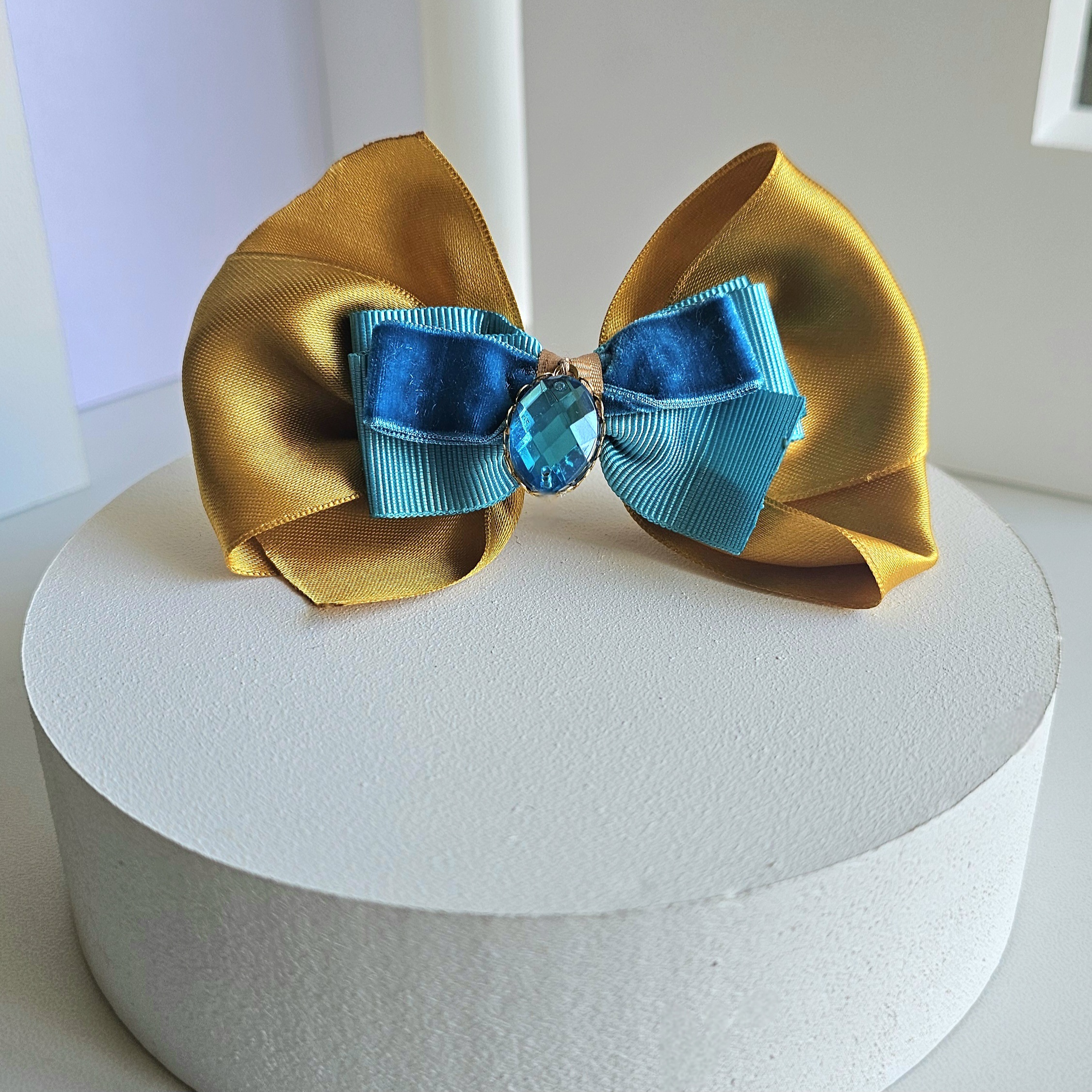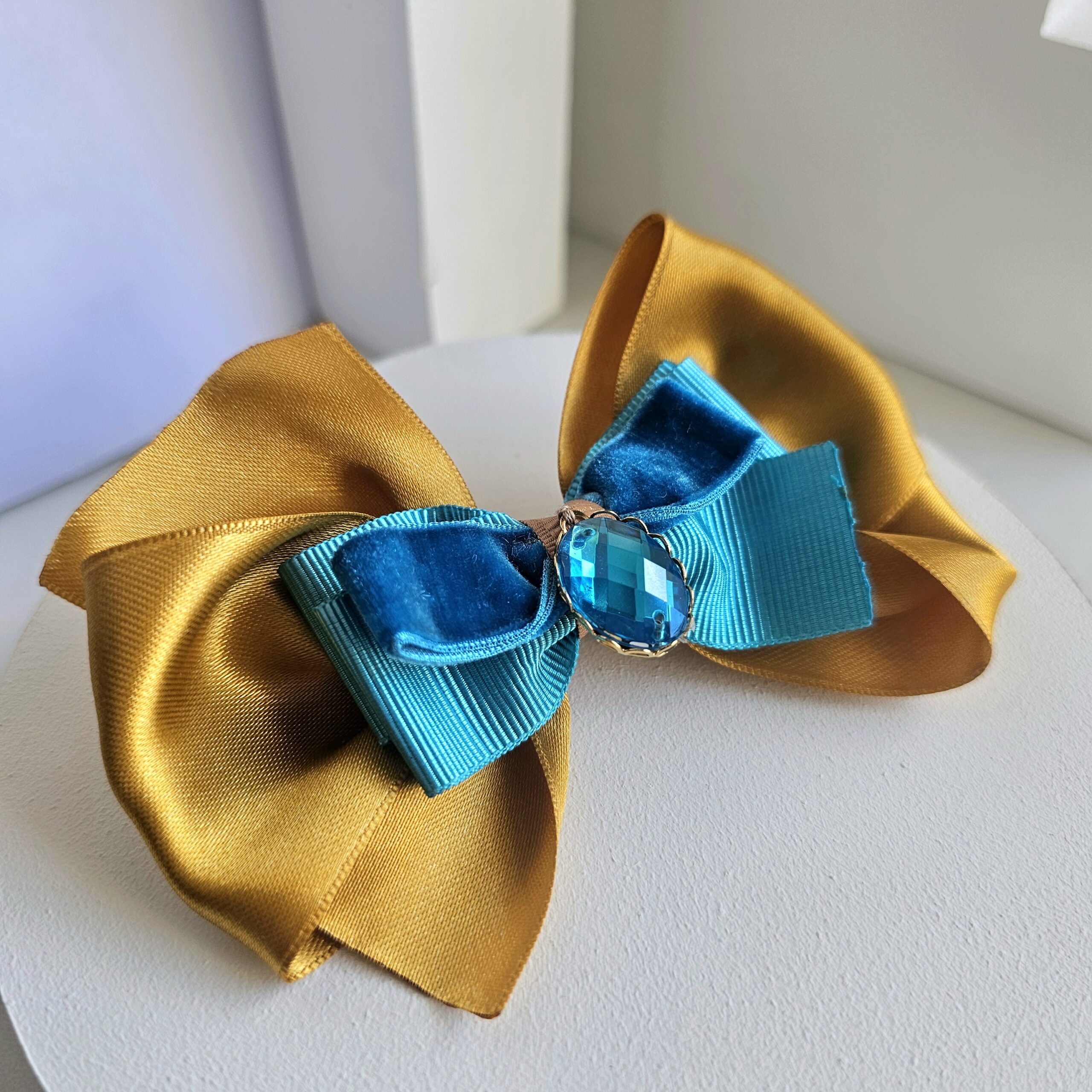- Materiales: combinación de cintas y dije turquesa.