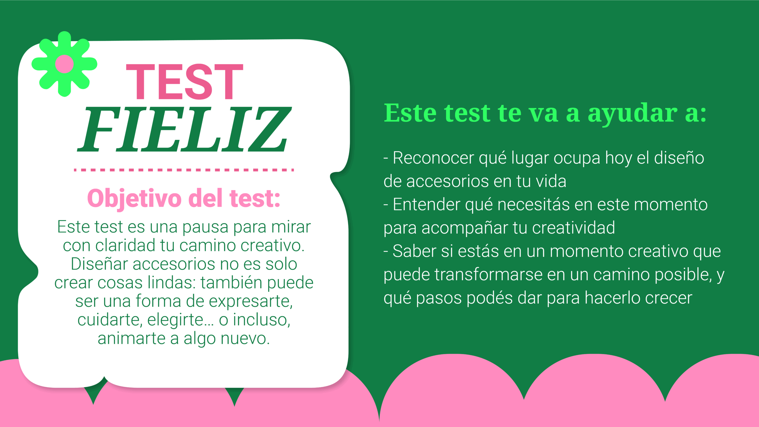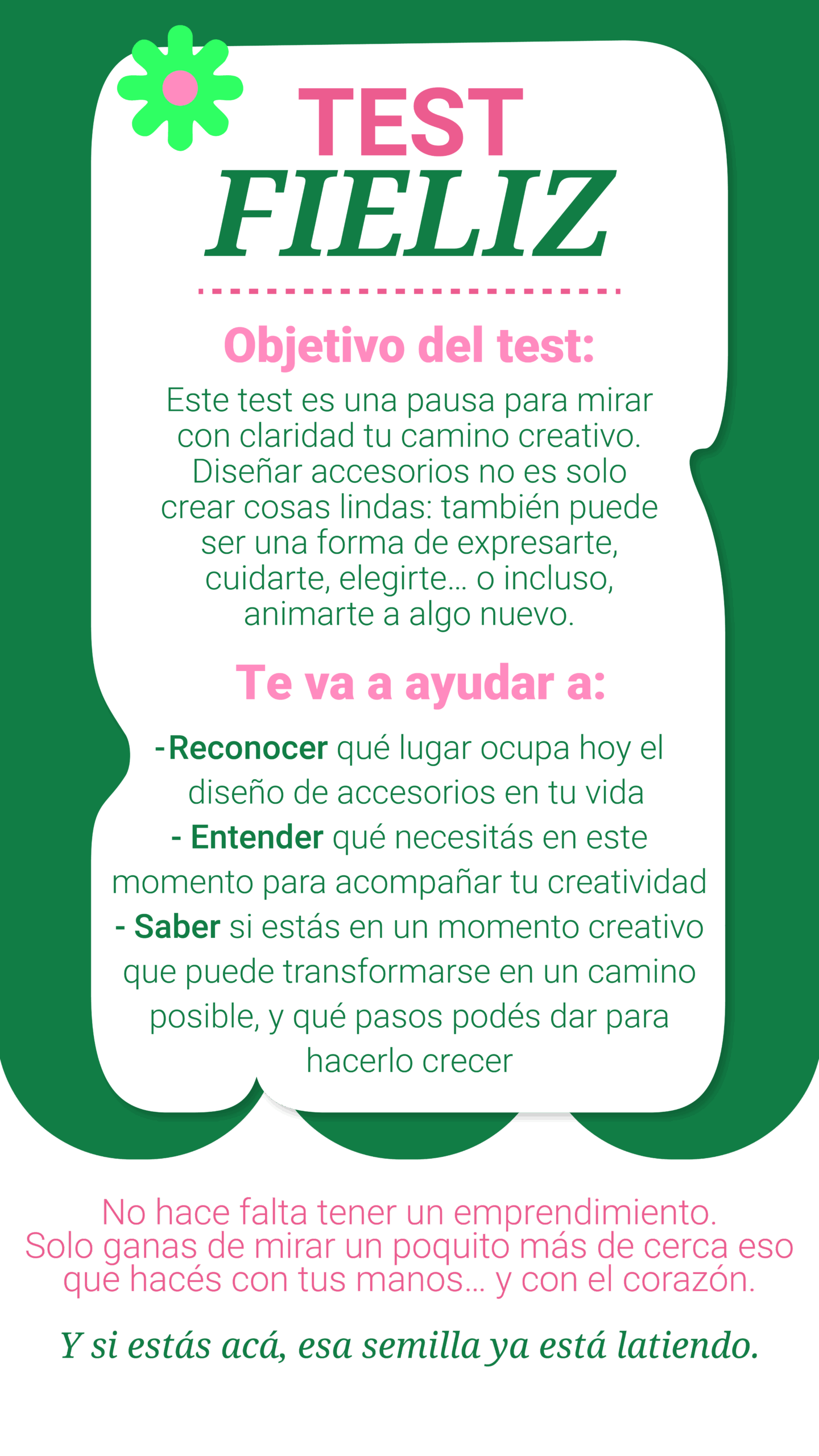 Test Fieliz (Obligatorio) Nombre Email(Obligatorio) Me encanta hacer, diseñar, probar técnicas e ir creando… pero todavía no me siento lista para vender mis accesorios.(Obligatorio) ❌ No me representa 🤔 Me pasa a veces 🌱 Voy en camino ✨ Estoy ahí 100% Siento que soy super creativa, disfruto mucho ese proceso, pero no sé cómo convertir todo eso en un negocio...(Obligatorio) ❌ No me representa 🤔 Me pasa a veces 🌱 Voy en camino ✨ Estoy ahí 100% Vendí algo (amigas, conocidas, etc), es algo que me gusta, tengo ganas… Lo que no tengo es idea de cómo emprender(Obligatorio) ❌ No me representa 🤔 Me pasa a veces 🌱 Voy en camino ✨ Estoy ahí 100% Siento que mi emprendimiento tiene mucho potencial, pero me cuesta enfocarme y priorizar. Estoy haciendo cosas, pero no sé si son las correctas.(Obligatorio) ❌ No me representa 🤔 Me pasa a veces 🌱 Voy en camino ✨ Estoy ahí 100% Estoy trabada! No tengo claridad para tomar decisiones que sé que importantes si quiero hacer crecer mi negocio.(Obligatorio) ❌ No me representa 🤔 Me pasa a veces 🌱 Voy en camino ✨ Estoy ahí 100% Siento que estoy haciendo muchísimo todo el tiempo, pero no veo resultado. Hago, hago hago y no llego a mi meta!(Obligatorio) ❌ No me representa 🤔 Me pasa a veces 🌱 Voy en camino ✨ Estoy ahí 100% Quiero ser una profesional con lo que hago y crecer en esto. Mi emprendimiento puede convertirse en un éxito!(Obligatorio) ❌ No me representa 🤔 Me pasa a veces 🌱 Voy en camino ✨ Estoy ahí 100% Estoy lista para tomar decisiones importantes sobre mi negocio. Creo que llegó el momento de hacerlo y pasar a un siguiente nivel.(Obligatorio) ❌ No me representa 🤔 Me pasa a veces 🌱 Voy en camino ✨ Estoy ahí 100% Tengo una marca de accesorios, pero siento que me hace falta “algo” más. Porque no es suficiente con vender! Es importante capacitarse y emprender en comunidad para poder aprender de las experiencias de otras que están en la misma.(Obligatorio) ❌ No me representa 🤔 Me pasa a veces 🌱 Voy en camino ✨ Estoy ahí 100% Emprender sola a veces es difícil… Hay días en los que me vendría bien apoyar y compartir con otras personas que entiendan del tema y puedan darme su opinión y compartir su experiencia.(Obligatorio) ❌ No me representa 🤔 Me pasa a veces 🌱 Voy en camino ✨ Estoy ahí 100%